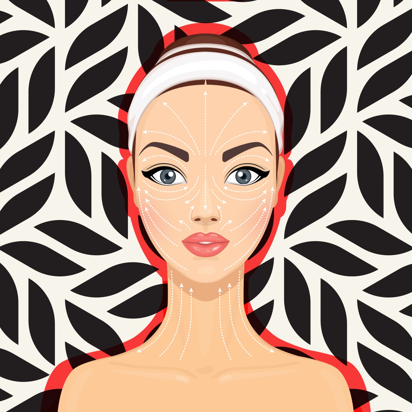 2. Aplique o produto em ambos os lados do rosto e comece a espalhar, sempre do centro do rosto para fora e em sentido contrário ao efeito da gravidade, tal como está exemplificado na imagem.