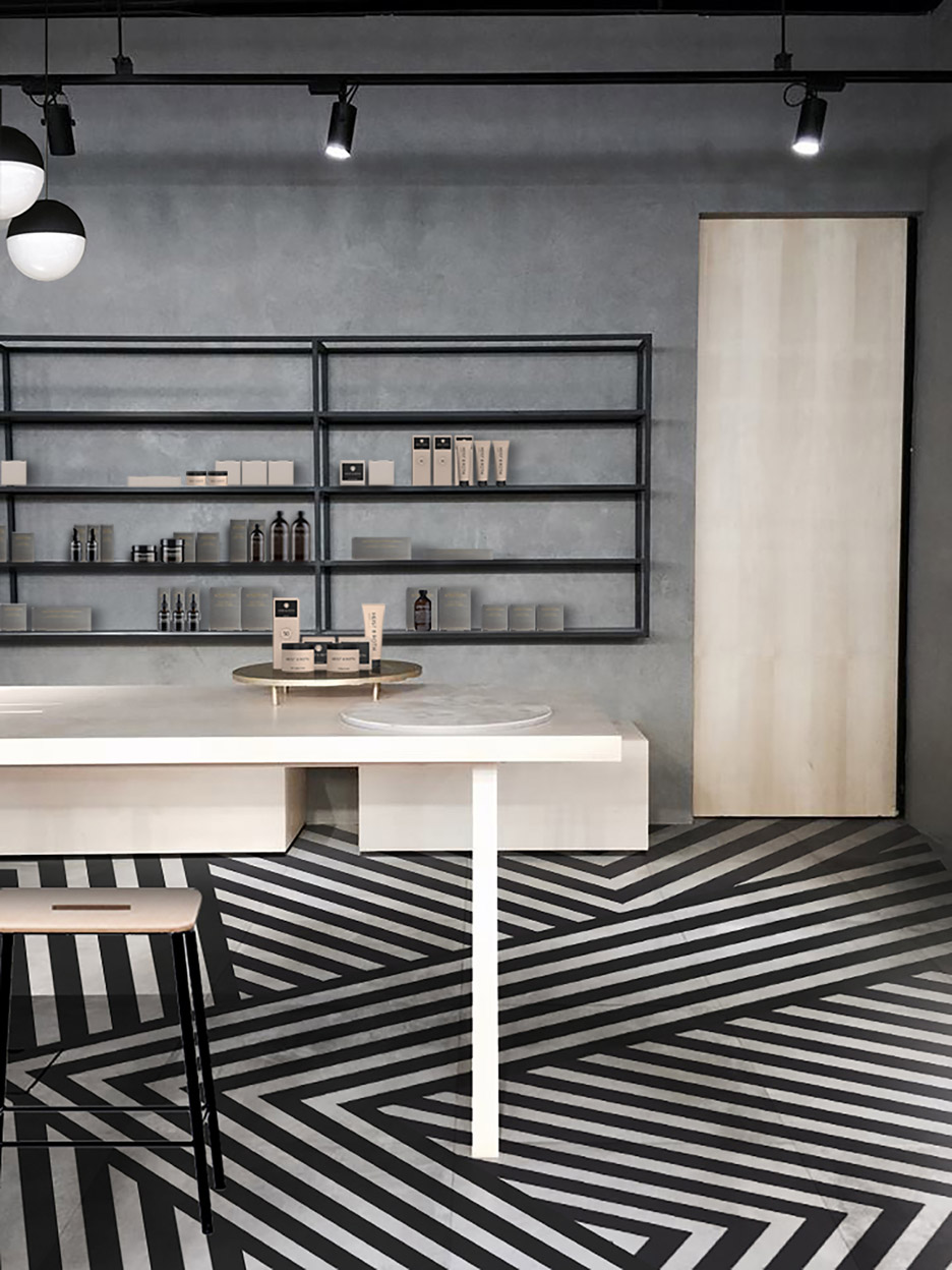 Alojada no centro comercial em Harbour City, a loja Facesss Lab de Hong Kong, em Tsim Sha Tsui, destaca-se pelo jogo cromático do chão, em madeira, um projeto do designer francês Aurélien Barbry que ali criou um padrão de riscas pretas e brancas para o chão, que se repetem.