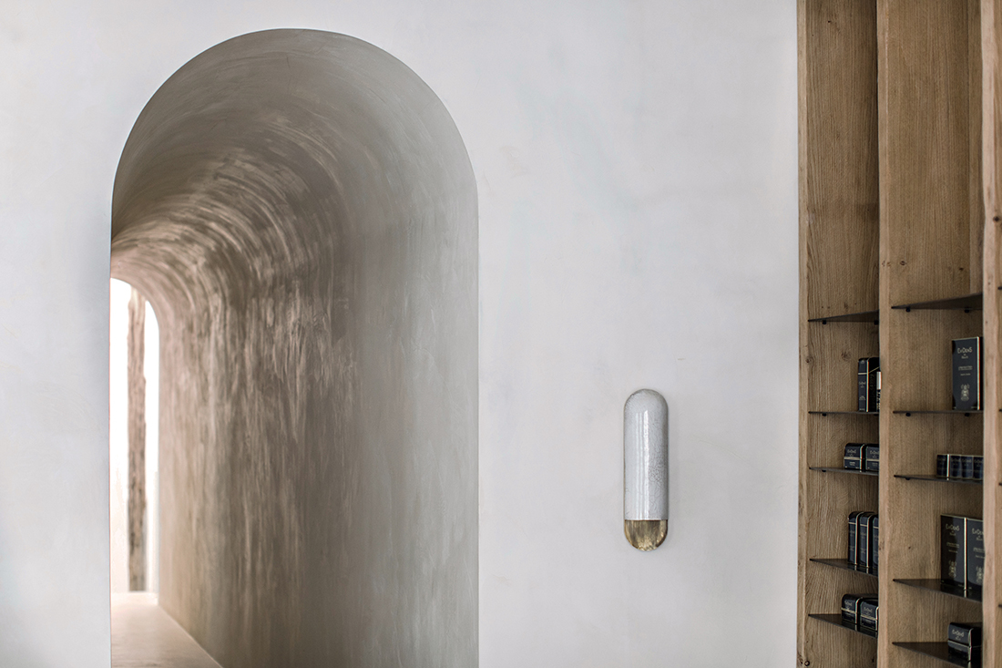 Com duas cabines dedicadas a tratamentos faciais e outra específica para os cuidados com o cabelo, as diferentes áreas foram distribuídas ao longo de um belíssimo arco, que conduz o cliente a uma escada onde se destaca o elemento central, o tronco de madeira tosco.