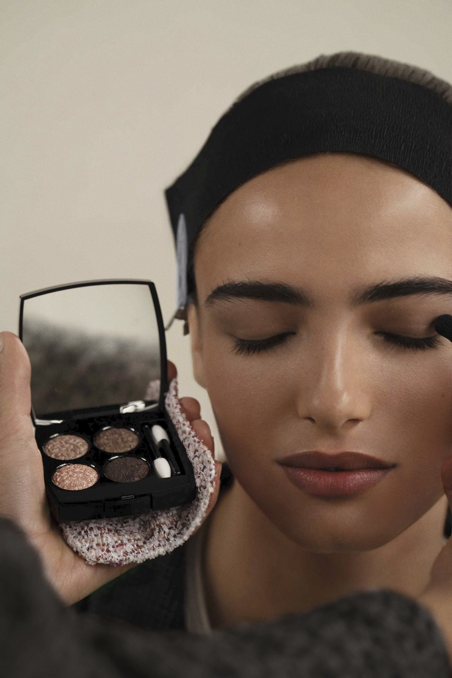 A Maison francesa arriscou numa tendência que já está a dar que falar: a maquilhagem preta, em representação de um estimo mais gótico, com olhos esfumados e lábios escuros. Em contraste, a pele natural e leve ajudou a intensificar ainda mais o olhar neutro mas intenso, que teve como protagonista a nova paleta de sombras Les 4 Ombres Tweed.