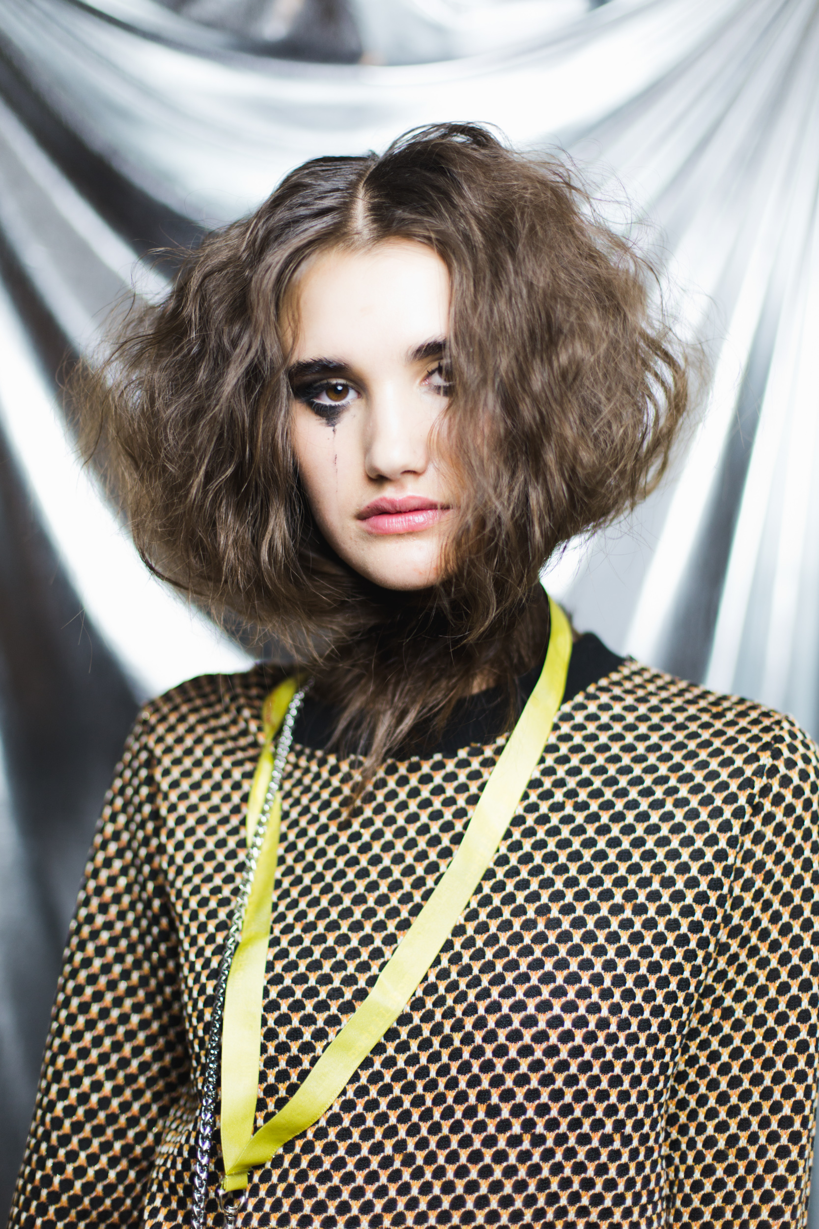 Para combinar com as roupas escuras que desfilaram, o look de beleza das modelos era igualmente dramático: os olhos, com um smokey eye preto, surgiram esborratados, como se as modelos tivessem estado a chorar mesmo antes de chegarem à passerelle. À medida que o desfile avançava, os olhos apareciam também mais chorosos e com mais “marcas” de lágrimas. O resto do rosto manteve-se simples e minimalista, com uma pele imaculada (e ligeiramente brilhante, que dava também a sensação de ter estado recentemente molhada) e os lábios brilhantes com um lip gloss translúcido. O cabelo, tão dramático como os olhos, era volumoso e enrolava-se à volta do pescoço, como se estivesse pronto a sufocar.
