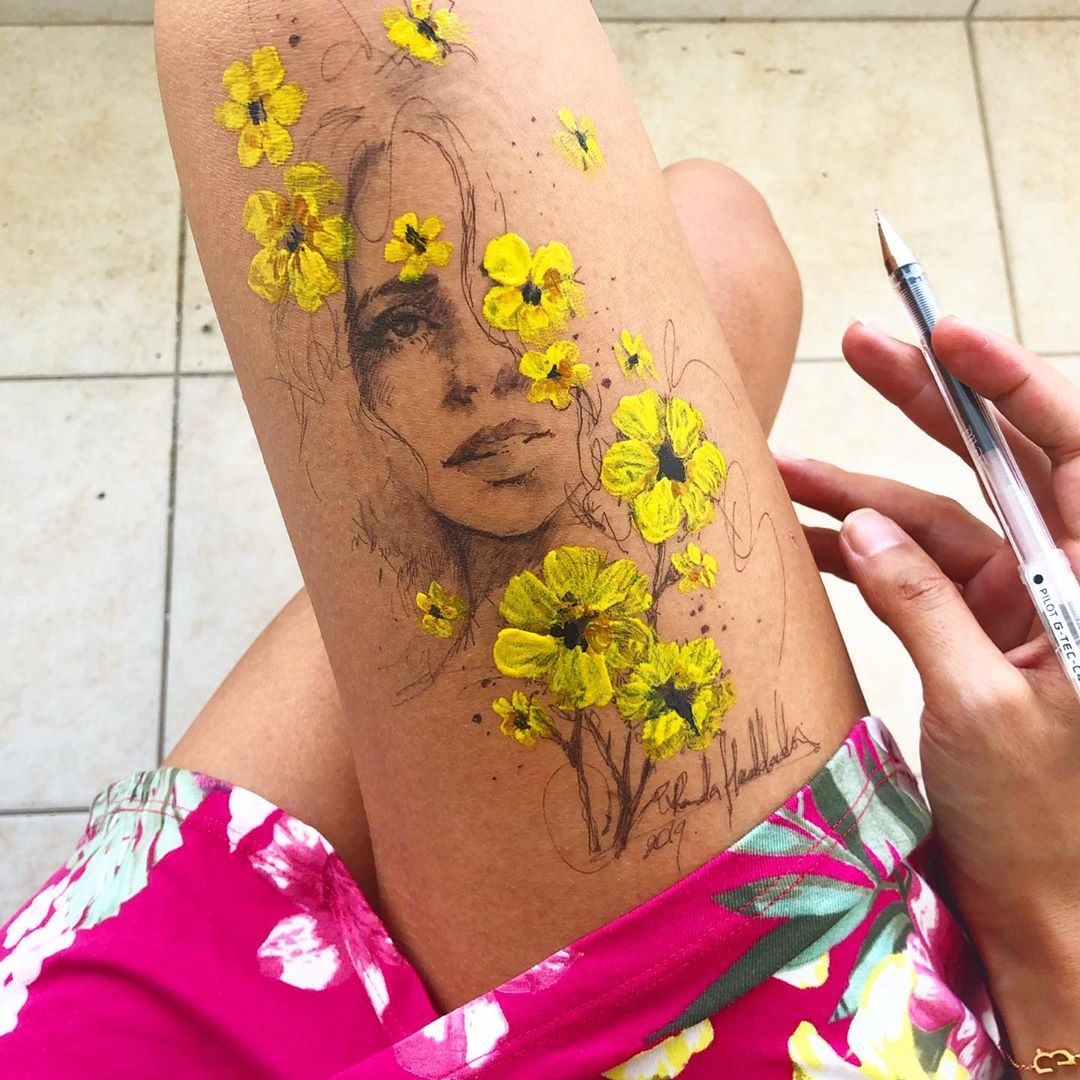 Mas e se lhe disséssemos que não são desenhos e pinturas tradicionais? Esqueça os pincéis, os lápis e a tela convencional. Randa usa as pernas como tela para desenhar e pintar retratos e flores, usando canetas que não tóxicas, tinta corporal e diferentes utensílios de maquilhagem skin-friendly.