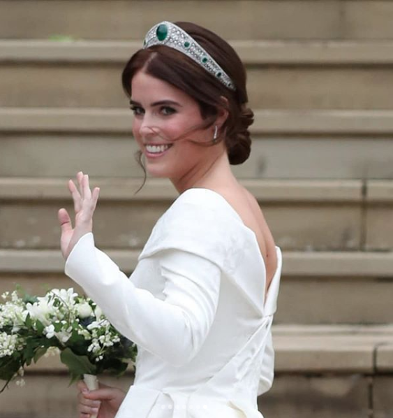 O casamento da Princesa Eugenie de Inglaterra com Jack Brooksbank não foi diferente, e todos os olhos estiveram atentos ao visual da noiva. Eugenie usou o seu cabelo preso num apanhado sóbrio, criado por Sonny-Jo MacFarlane do salão londrino Hari’s. Embora clássico e intemporal, algumas madeixas de cabelo foram deixadas mais soltas para um look mais natural, que emoldurou a tiara com diamantes e esmeraldas usada pela Princesa no dia do casamento.
