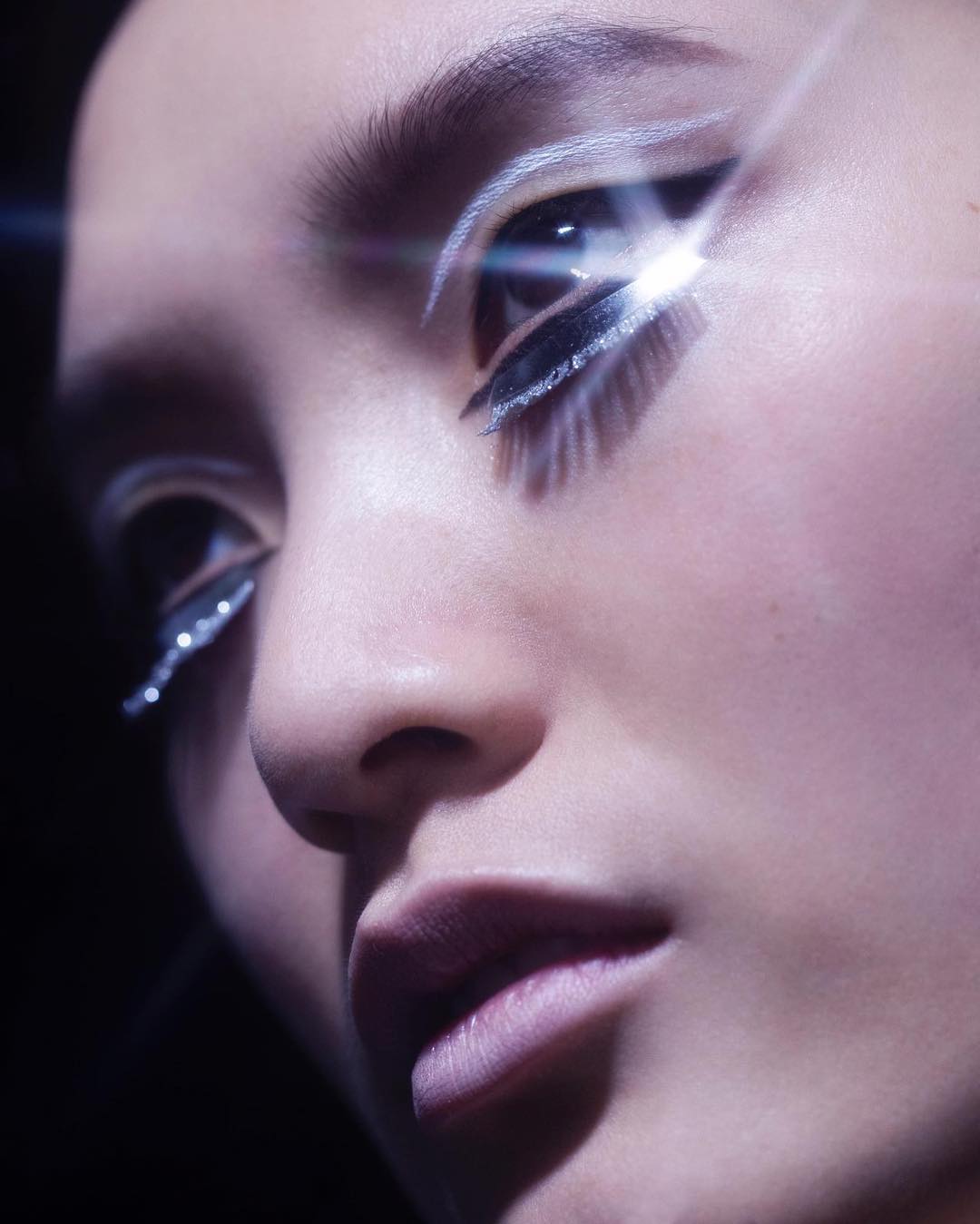Val Garland levou a referência clássica de Twiggy, inspiração de Beleza no desfile da Dior, e deu-lhe um twist futurista no backstage de Giambattista Valli. Eyeliners preto e branco pintaram as pálpebras móveis (que permaneceram com pestanas livres de máscara), enquanto pestanas falsas, grossas e prateadas, adicionavam drama ao contorno de olhos. O resultado foi um look futurista, mas clean – um visual que Twiggy provavelmente usaria se vivesse no Espaço.