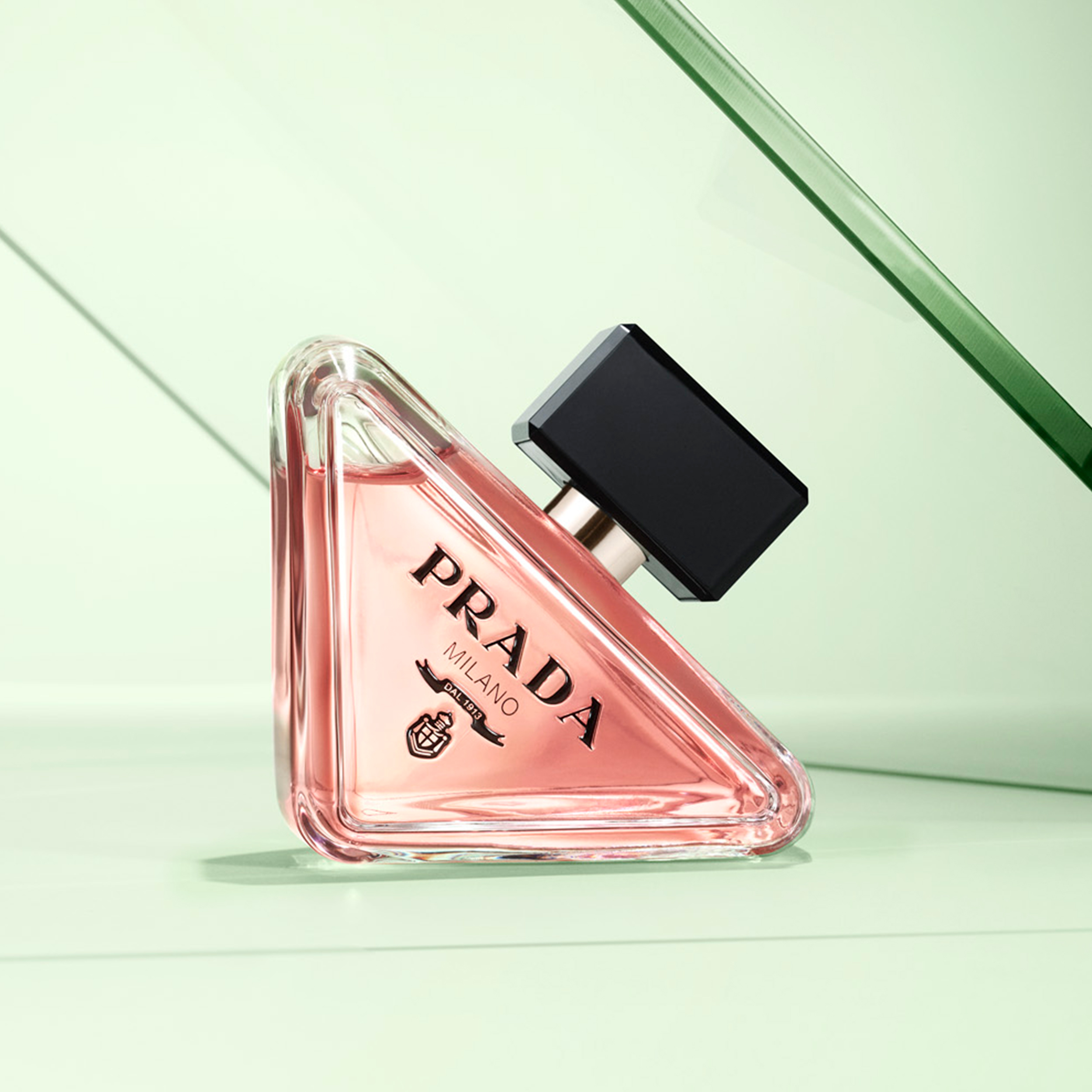 Inspirado pelo inconfundível triângulo Prada, o frasco reinventa um dos mais conhecidos logotipos do Mundo da Moda. Distinto dos tradicionais formatos quadrados, retangulares ou até redondos, o frasco explora o triângulo nas suas facetas: inclinado mas estável, assente mas deslocado, infinitamente replicável, eternamente associável à marca que lhe dá nome.