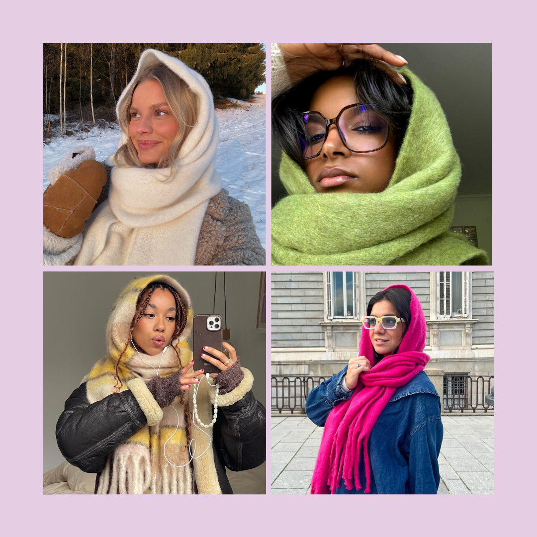 O truque de styling consiste em converter um cachecol macio e oversized num género de capuz, cobrindo a cabeça, dando um toque de mistério e sofisticação. As influenciadoras já adotaram a tendência, combinando-a com casacos quentinhos de inverno e óculos de sol, criando um visual minimalista moderno ao estilo escandinavo.